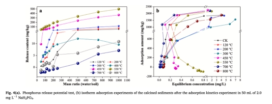 吸附與釋放特性:550°C煅燒沉積物對磷的吸附容量最高(Qmax = 2845.9 mg/kg),但釋放風險大;700–800°C煅燒樣品釋放潛力最低(圖4a)。