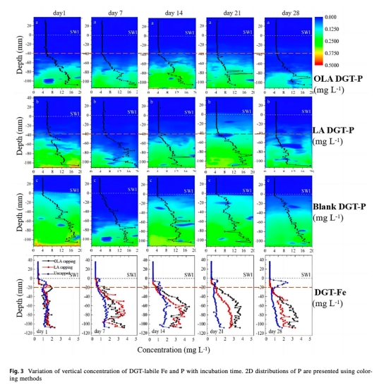 磷釋放抑制:OLA使孔隙水SRP濃度降低82%(對照組的0.18 mg/L→0.05 mg/L),DGT有效態磷在0-70mm深度顯著降低(圖2, 圖3)。
