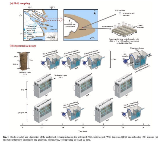 研究通過模擬潮汐周期(水淹、干燥、再淹)實驗,探究長江口潮間帶沉積物中n-DAMO(亞硝酸鹽/硝酸鹽依賴型厭氧甲烷氧化)微生物群落、豐度及活性的響應機制。主要發現: