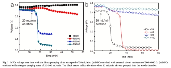 方法有效性:小外部電阻(≤500Ω)或高氮氣吹掃速率(≥80 mL/min)富集可構建耐氧生物陽極,電壓損失降至6.4%以下。