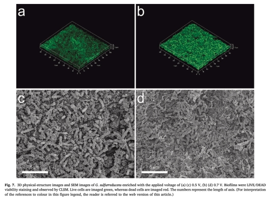 純菌(Geobacter sulfurreducens PCA)驗證電壓調控對生物膜結構的影響(圖6-7)。