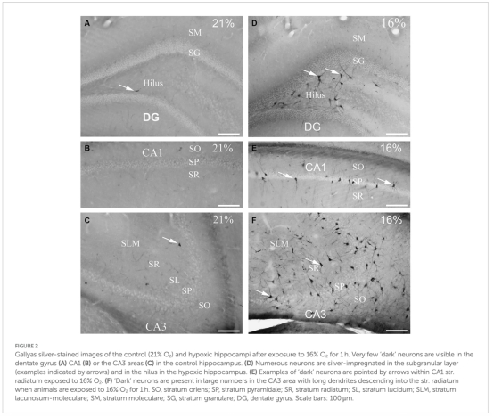 結(jié)構(gòu)損傷:Gallyas銀染法顯示缺氧導致海馬門區(qū)(hilus)生長抑素(SST)陽性抑制性神經(jīng)元出現(xiàn)“暗神經(jīng)元”(退化早期標志),CA3區(qū)損傷最顯著(圖2-3)。