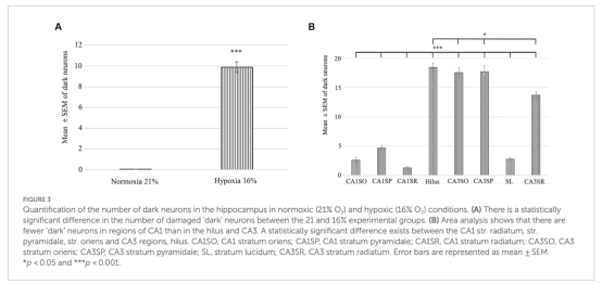 數(shù)據(jù):缺氧組CA3區(qū)暗神經(jīng)元數(shù)量顯著高于常氧組(CA3 str. pyramidale: 17.57±5.26 vs. 對照組≈0)。