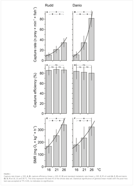溫度升高顯著增強魚類捕食率:兩種浮游生物食性魚類(溫帶的紅眼魚 Scardinius erythrophthalmus 和熱帶的馬拉巴斑馬魚 Devario malabaricus)在16°C、21°C和26°C下捕食水蚤(Daphnia magna)。捕食率(CR)的Q??值遠超2(紅眼魚Q??=3.22,馬拉巴斑馬魚Q??=7.40),表明溫度每升高10°C,捕食率增加超過2倍(圖1)。