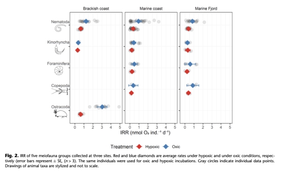 個體呼吸速率(IRR):10個微型底棲生物類群(線蟲Nematoda、動吻動物Kinorhyncha、有孔蟲Foraminifera、橈足類Copepoda、介形蟲Ostracoda、水螨Water mites、鰓曳蟲Priapulida幼體、雙殼類Bivalvia幼體、多毛類Polychaeta幼體、腹足類Gastropoda幼體)在常氧和低氧條件下的個體呼吸速率(單位:nmol O2 ind?1 d?1)。(數據點主要來自圖2,平均值和趨勢線來自圖2和正文描述)。
