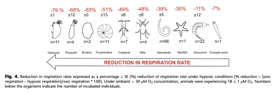 生物量特異性呼吸速率(MR):上述主要類群(線蟲、動吻動物、有孔蟲、橈足類、介形蟲)在常氧和低氧條件下單位生物量的呼吸速率(單位:nmol O2 μg?1 d?1)。(數據點主要來自圖3)。