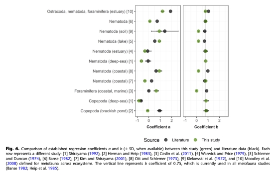 異速生長系數比較:將本研究建立的系數(a, b)與歷史數據進行比較(圖6),發現無顯著差異,支持了從不同生境(包括深海)獲得的異速方程在相似環境條件下估算沿海微型底棲生物呼吸的有效性(但需注意有殼類偏差)。這為跨生境比較和模型參數化提供了依據。