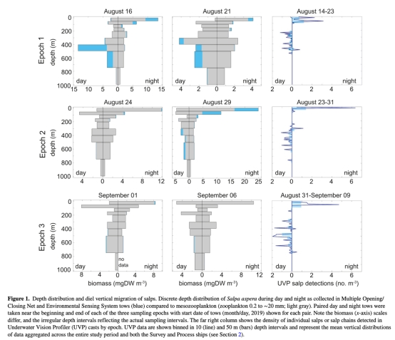 意義:證實樽海鞘晝夜垂直遷移(白天300–750 m,夜間0–100 m),揭示其聚集行為對碳輸出的空間影響。