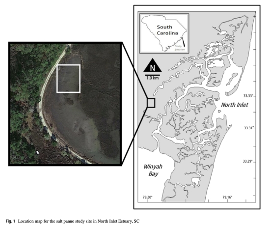本研究首次量化了美國(guó)南卡羅來(lái)納州北灣河口(North Inlet Estuary)鹽沼洼地(supratidal salt panne)中底棲微藻(BMA)的生物量、群落組成、凈初級(jí)生產(chǎn)力(NPP)及招潮蟹(Leptuca pugilator)的攝食影響。關(guān)鍵發(fā)現(xiàn)包括: