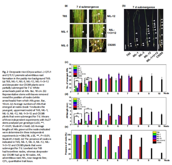 根系數量與長度 圖2c-d NIL-12的AR2數量比T65高2倍,表明QTL12促進根系增殖(洪水適應)。
