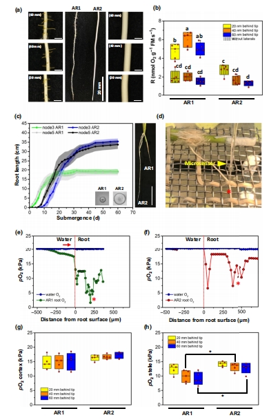徑向氧分布(Unisense) 圖4e-h AR2根表氧濃度高于AR1,證實其形成氧擴散屏障(減少洪水缺氧損耗)。