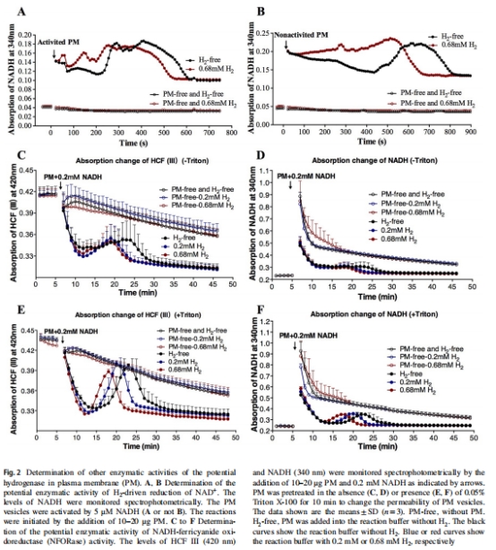 功能機(jī)制:氫酶活性參與NAD?/NADH氧化還原循環(huán)(圖2A-B)和NADH-鐵氰化物氧化還原酶(NFORase)活性(圖2C-F),H?加速這些反應(yīng)。