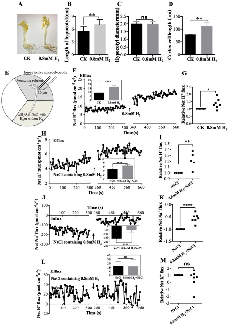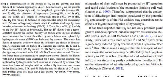 生理效應(yīng):富氫水(HRW)通過增強(qiáng)H?外排促進(jìn)綠豆下胚軸伸長(圖3B,D,F),并在鹽脅迫下減少Na?內(nèi)流(圖3J-K)。