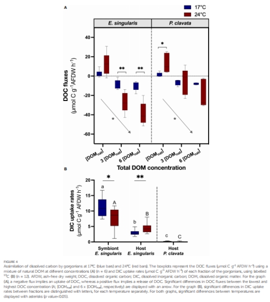 論文通過實驗探究地中海兩種溫帶柳珊瑚(共生型Eunicella singularis和非共生型Paramuricea clavata)在17℃(正常溫度)和24℃(熱應激)下對溶解無機/有機碳(DIC/DOC)和氮(DIN/DON)的吸收能力。主要發現: