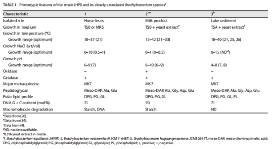形態生理:革蘭陽性、無鞭毛、橢圓桿狀,生長條件(溫度18–37°C, pH 6–9, NaCl 0–10%)(表1)。