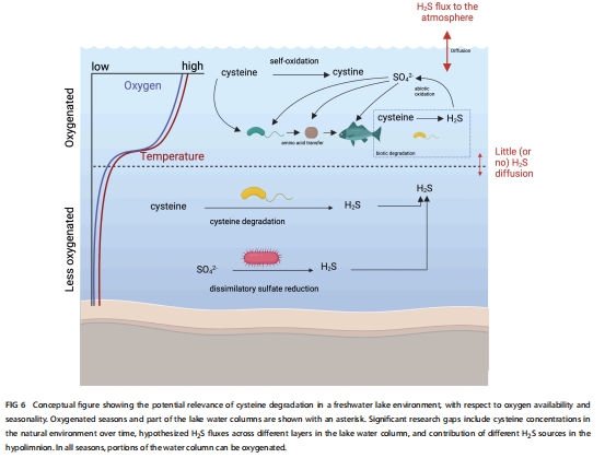 論文揭示了淡水湖泊富氧環(huán)境中細(xì)菌通過降解半胱氨酸(Cysteine)產(chǎn)生硫化氫(H?S)的現(xiàn)象。傳統(tǒng)認(rèn)為H?S主要源于缺氧環(huán)境的硫酸鹽還原,但本研究證明多種細(xì)菌(如變形菌門、擬桿菌門)可在有氧條件下通過降解半胱氨酸釋放H?S,拓展了對(duì)硫循環(huán)的認(rèn)知。