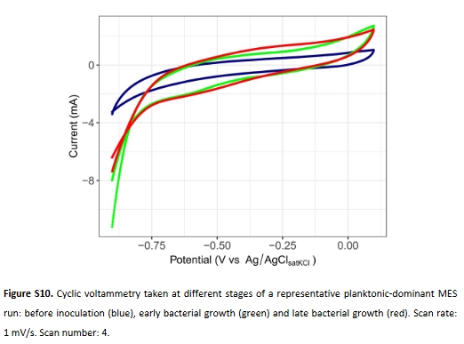 電流密度 恒電位儀(圖4A) 浮游表型電流密度(-0.45 mA cm?2)更高,關聯更高代謝活性。