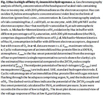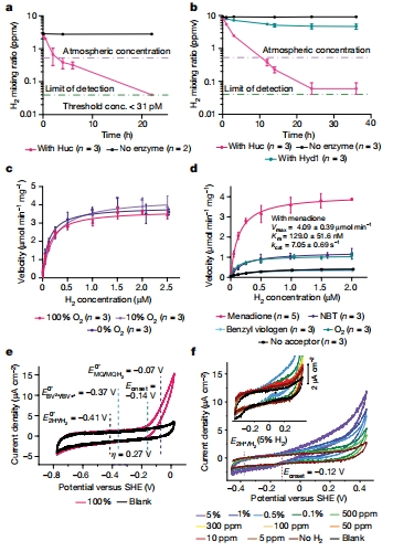 超高親和力:Huc的Km=129 nM,可氧化低至31 pM的H?(圖1a,d),遠超傳統氫酶(Km>500 nM)。