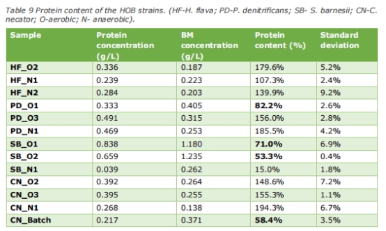 蛋白質含量 表9 評估SCP營養價值。結果異常(>100%),因生物量測量誤差(如C. necator批次培養58.4%較合理)。