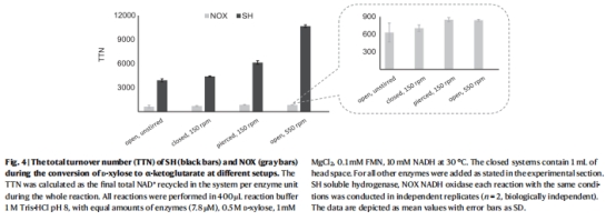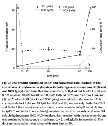 性能優勢:在D-木糖→α-酮戊二酸的多酶級聯中,SH的NAD?周轉數(TTN)高達44,000 mol/mol酶,遠超NOX(圖4)。
