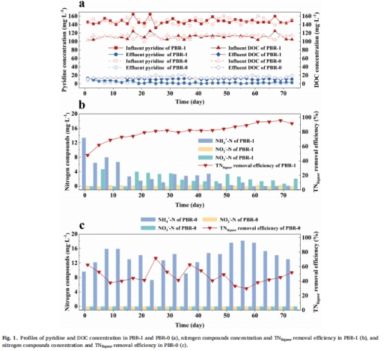 吡啶與TN同步去除 圖1b ABA系統(tǒng)TN去除率>80%,顯著優(yōu)于對照組PBR-0(<60%)