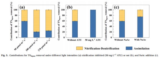 硝化-反硝化貢獻(xiàn)率 圖5a 光照180 μmol·m?2·s?1時,硝化-反硝化占TN去除79.3%