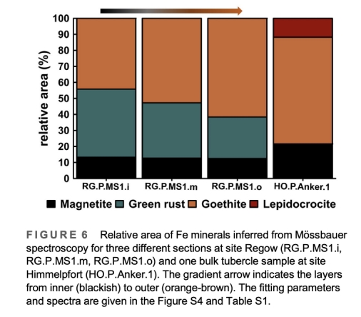數據:銹瘤外層以針鐵礦(α-FeOOH)為主(44-66%),內層含綠銹(Fe3?Fe2?(OH)?Cl)