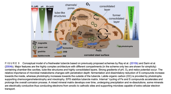 銹瘤是腐蝕熱點:多層結構形成化學梯度,外層為氧化區(光養菌主導),內層為還原區(硫酸鹽還原菌/鐵還原菌活躍)
