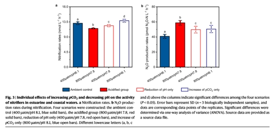 pCO?與pH獨(dú)立效應(yīng)(圖3):高pCO?僅在非酸化條件下促進(jìn)硝化("CO?施肥效應(yīng)"),酸化條件下則加劇抑制作用,表明酸化抵消了CO?對(duì)硝化菌的潛在益處。