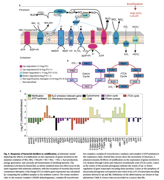 分子機(jī)制上,硝化菌通過上調(diào)V型ATP酶基因(維持胞內(nèi)pH穩(wěn)態(tài))和nor基因(增加N?O生成)響應(yīng)酸化脅迫。