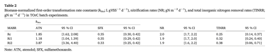 TOrCs去除選擇性:高頻間歇曝氣(Ri2)顯著提升阿替洛爾去除率(kbio提高109%),磺胺甲惡唑不受影響,異養(yǎng)菌主導(dǎo)降解。