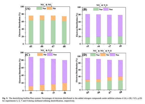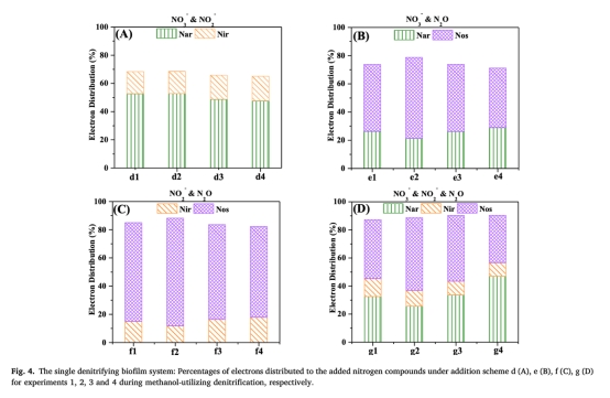 電子分布比例:計算電子流向Nar、Nir、Nos的比例(Eq 9)。來源:圖4(單一系統(tǒng))、圖5(絮體系統(tǒng))。意義:揭示絮體促進電子流向Nos(圖5D中占比60%-48%),而單一系統(tǒng)中電子更傾向Nar(圖4D中Nar占比增加21.4%),解析電子競爭發(fā)生在不同電子池。