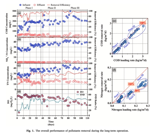 典型周期實驗數據:包括污染物濃度隨時間變化(如NH4-N、TN)和DO動態。來源:圖2a-c和圖2d。研究意義:揭示系統在短時間內的去除動力學(如TN在180分鐘內快速下降),證明SND過程的發生(NO3-N生成量低于NH4-N消耗量),并確認旋轉設計實現穩定DO環境(6-9 mg/L),支持無需外部曝氣的運行模式。