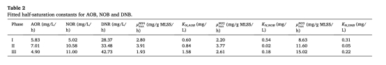 微生物動力學數據:包括氨氧化速率(AOR)、亞硝酸鹽氧化速率(NOR)、反硝化速率(DNR)及Monod動力學參數(如KN,AOB)。來源:圖3和表2。研究意義:量化功能菌活性(如DNB速率高達42.73 mg/L/h),解釋生物膜內擴散阻力變化(KN,AOB上升),并關聯系統脫氮效率提升(如μmaxNO3增加至15.02 mg/g MLSS/h),為優化生物膜載體設計提供依據。