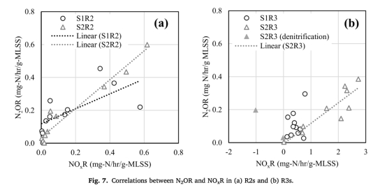 工藝優化指向:通過對比R2的N?OR與NO?R量級關系(圖7a),明確高排放時段與NO??積累的耦合性,為DO/pH精細化調控提供依據