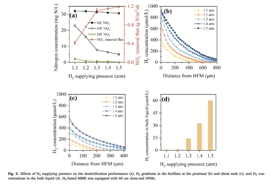 反硝化通量(圖3a, 5c, 6a):H?壓力1.2 atm時,周期性排氣使通量從0.79 g N/m2/d(封閉式)提升至1.18 g N/m2/d。