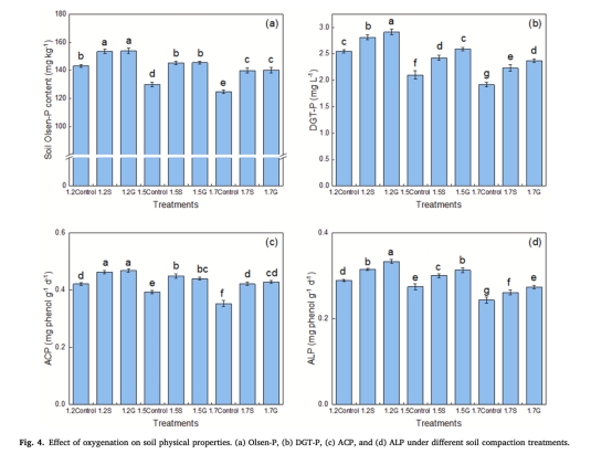 磷有效性:增氧提高Olsen-P 7.17-12.1%(圖4a)和DGT-P 10.5-23.6%(圖4b),增強酸性磷酸酶(ACP)和堿性磷酸酶(ALP)活性(圖4c, 4d)。