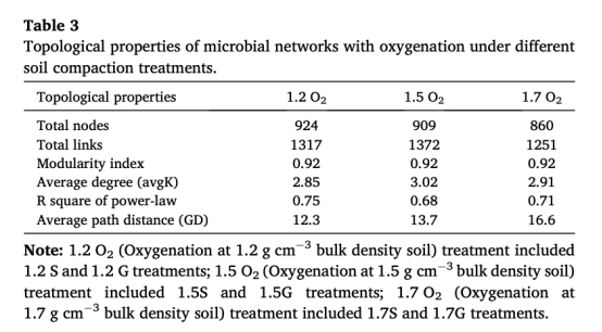 微生物群落:增氧增加土壤細菌多樣性(圖5d),富集溶磷菌(Firmicutes和Proteobacteria,圖5a),并在中度板結土壤(1.5 g cm?3)中構建更穩定的微生物共現網絡(圖6,表3)。