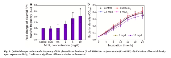 質粒轉移機制:MoS?納米片劑量依賴性地加速RP4質粒在E. coli間的水平轉移頻率(10 mg/L時達對照的2.07倍),而塊體MoS?無此效應(圖1b, 圖2a)。