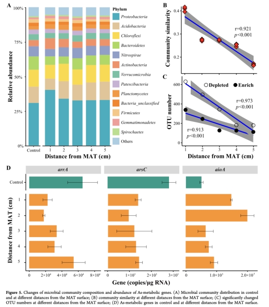 微生物響應:qPCR定量砷代謝基因(arrA、arsC、aioA),高通量測序分析微生物群落(圖5)。