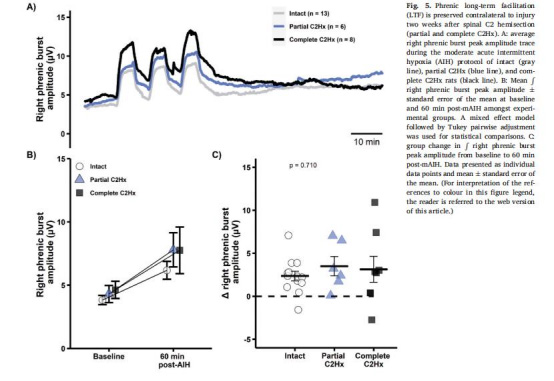 評估損傷嚴重性(部分性vs.完全性C2Hx)對mAIH誘導的pLTF(同側/對側)和sympLTF的影響。