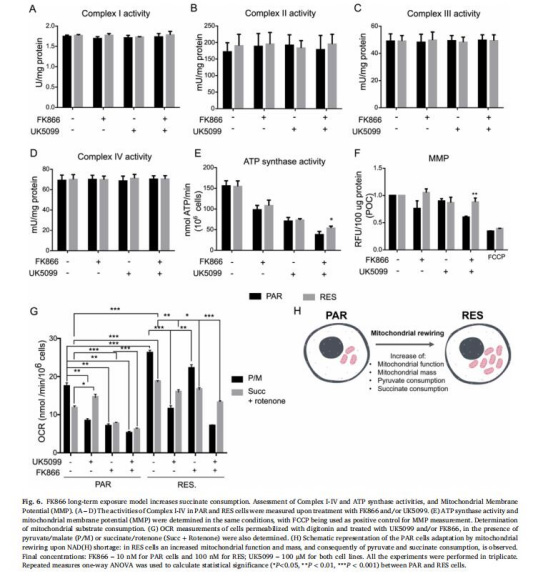 呼吸鏈復合物I-IV活性無差異,但ATP合成酶活性在FK866+UK5099處理下RES細胞更高。