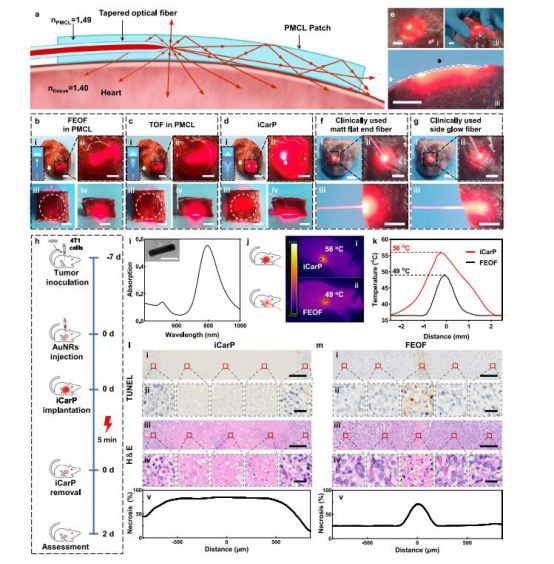 iCarP光照5分鐘,腫瘤中心溫度達56°C,2 mm直徑區域>45°C(圖4k);傳統光纖僅49°C,1 mm區域>45°C。