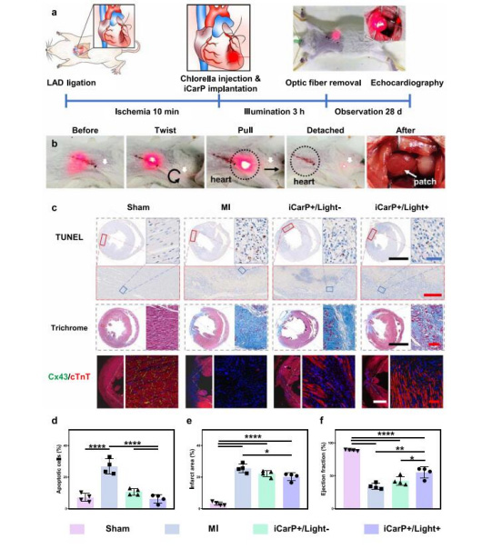在體應用:小鼠腫瘤光熱治療(圖4j,k)、大鼠心肌梗死光合治療(圖5c-f)、犬類微創植入(圖6b-d)。