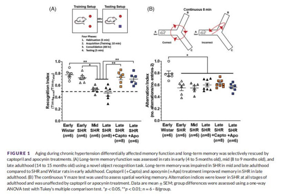 數(shù)據(jù):老年SHR的NOR識(shí)別指數(shù)顯著降低(p<0.01),卡托普利和阿魏酸部分挽救長期記憶(圖1A);Y迷宮工作記憶在SHR中持續(xù)受損且治療無效(圖1B)。