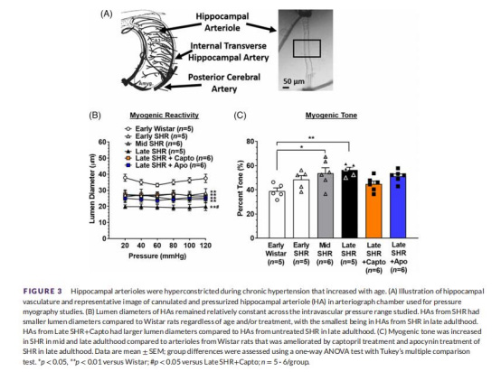 關(guān)鍵機(jī)制:血管緊張素II信號(hào)通路是核心驅(qū)動(dòng)因素——ACE抑制劑卡托普利(captopril)恢復(fù)海馬血流、改善血管功能并挽救記憶,而抗氧化劑阿魏酸(apocynin)無效。