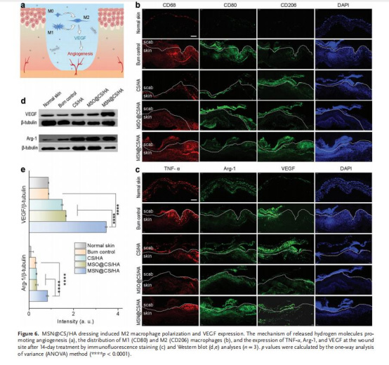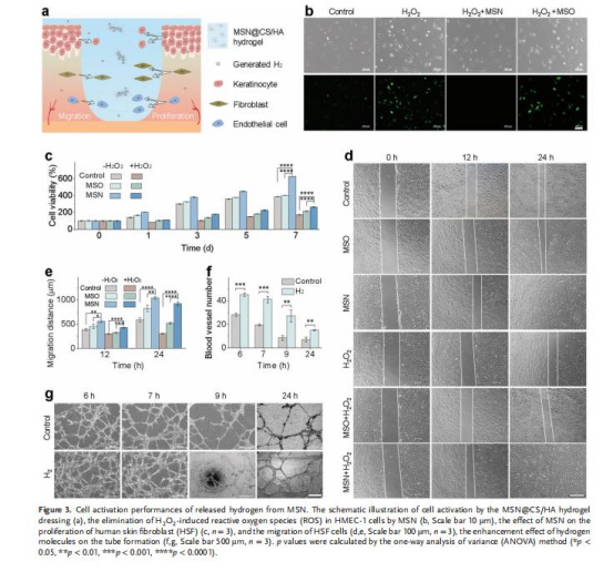 持續(xù)釋氫曲線(圖1d)與血管新生時間窗(圖3f顯示6小時為管形成峰值)高度匹配,解釋為何MSN@CS/HA組在燒傷早期(≤7天)即顯效(圖2b)。