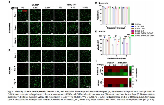 缺氧下存活率(圖2D):SNP組細胞存活率<50%,而OMP/SNP-OMP組>90%。