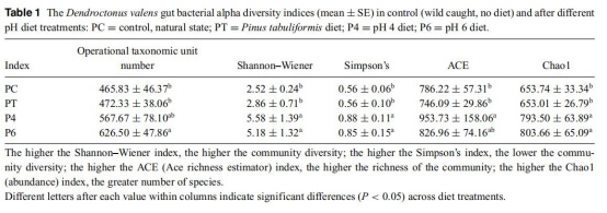 本研究探究了腸道pH環境對紅脂大小蠹(Dendroctonus valens)腸道菌群組成及其關鍵聚集/反聚集信息素verbenone產量的影響: