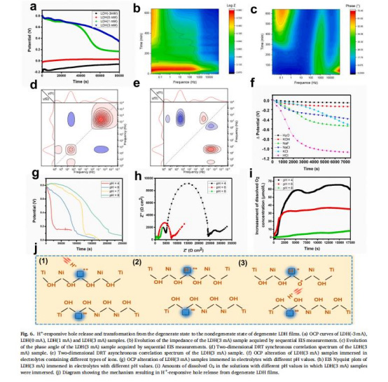 2.空穴釋放的pH依賴性源于H?在LDH晶格中的高遷移率(圖6j),加速電荷中和。